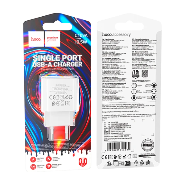 Сетевое З/У HOCO C109A 1USB 10.5W белый (1/36/216)