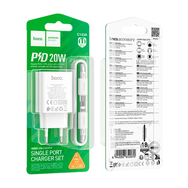 Сетевое З/У HOCO C143A Type-C 20W PD,QC с кабелем Lightning.