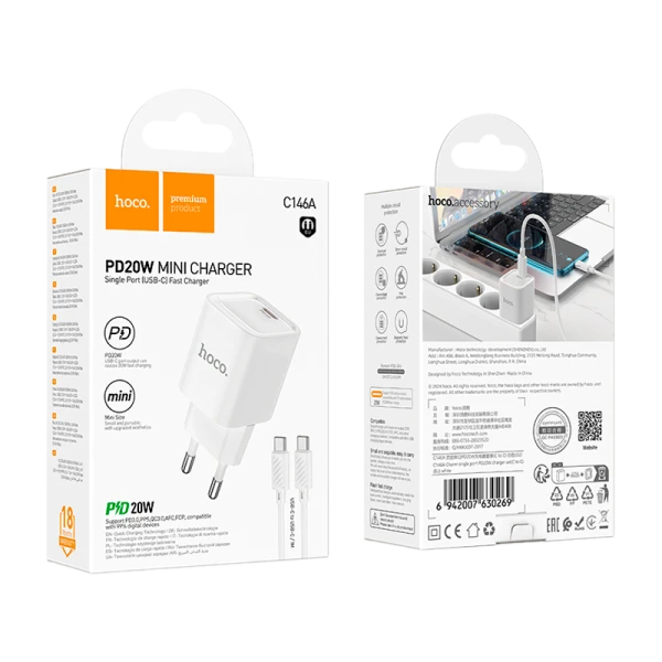 Сетевое З/У HOCO C146A Type-C 20W PD3.0 с кабелем Type-C белый.