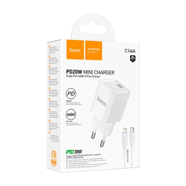 Сетевое З/У HOCO C146A Type-C 20W PD3.0 с кабелем Lightning белый.