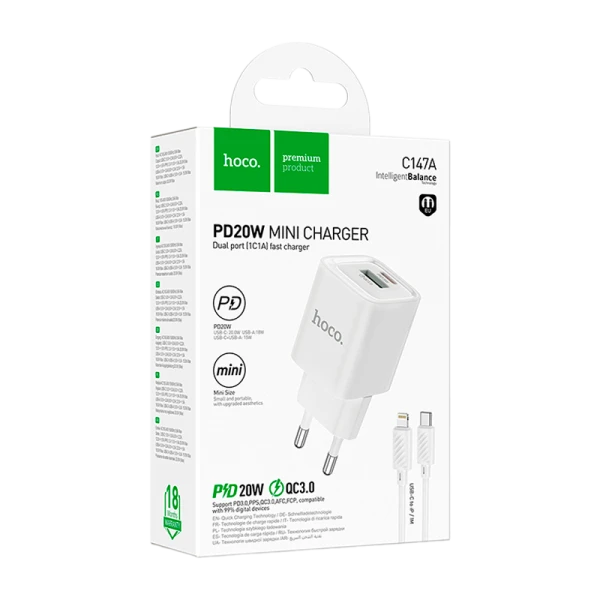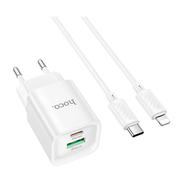 Сетевое З/У HOCO C147A 1USB+1Type-C 3.0A 20W PD,QC с кабелем Lightning белый (1/30/180)