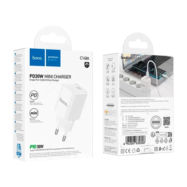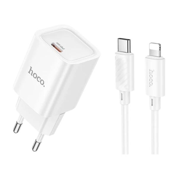 Сетевое З/У HOCO C148A Type-C 3.0A 30W PD3.0 с кабелем Lightning белый цвет. Универсальное сетевое зарядное устройство для электронной техники с портом Type-C для быстрой зарядки.