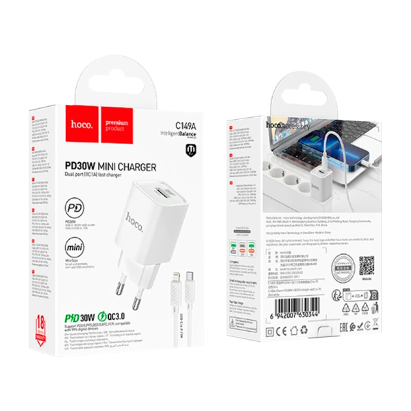 Сетевое З/У HOCO C149A 1USB+1Type-C 3.0A 30W PD,QC с кабелем Lightning белый (1/30/180)