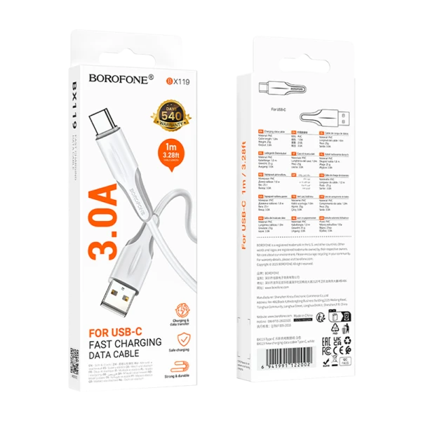 Кабель Borofone BX119 USB (m)-Type-C (m) 1м 3.0A ПВХ белый (1/360)