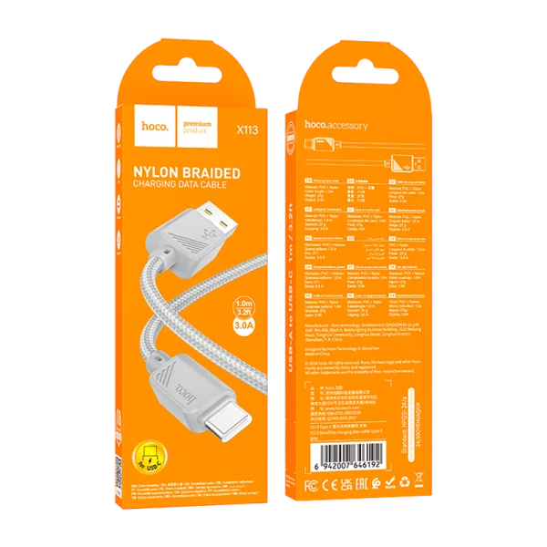 Кабель HOCO X113 USB (m)-Type-C (m) 1м 3.0A нейлон серый;