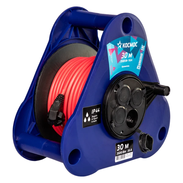 Удлинитель Космос 4р.Б/З 16A 30.0м ПВС 2x2.5мм² IP44 на катушке треуг.