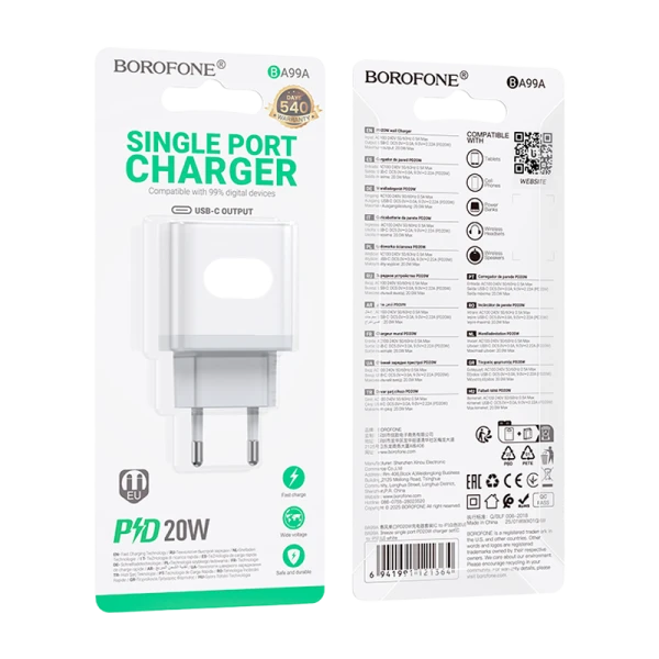 Сетевое З/У Borofone BA99A Type-C 3.0A 20W белый (1/75/300)