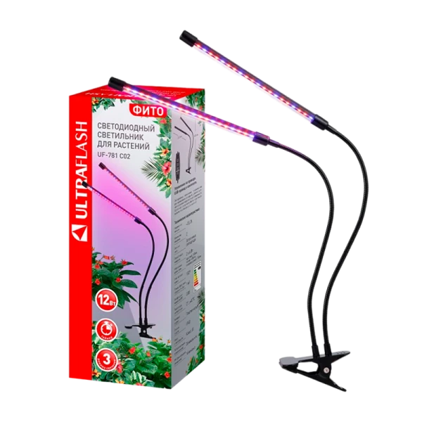 Светильник настольный Ultraflash UF-781 ФИТО 12W прищепка 3 режима черный (1/20)