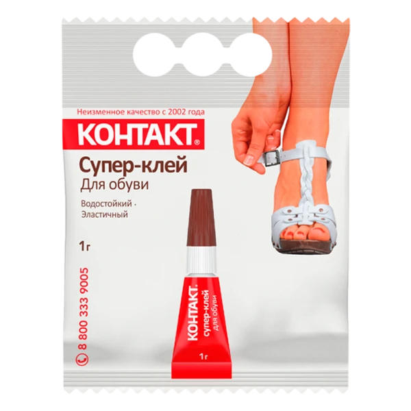 Супер-клей Контакт на основе этилцианакрилата с усиленной формулой, специально разработанный для ремонта обувных материалов: кожи, резины, термопластика и синтетических подошв. Благодаря гелевой текстуре предотвращает растекание, обеспечивая точечное нанесение и моментальную фиксацию деталей. Устойчив к влаге и перепадам температур после полного высыхания, оптимален для экстренного восстановления стелек, каблуков и отклеившихся элементов, не оставляет следов при аккуратном использовании.