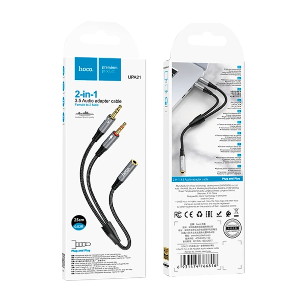 Кабель AUX HOCO UPA21 Jack 3.5mm (f)-2xJack 3.5mm (m) 0.25м серебряный цвет.