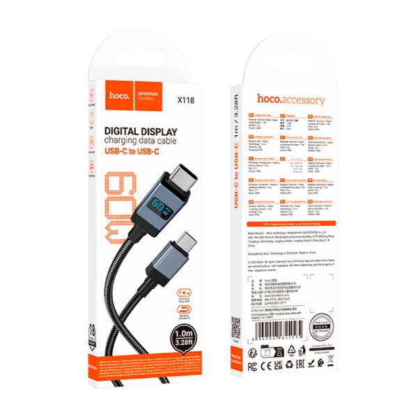 Кабель HOCO X118 Type-C (m)-Type-C (m) 1м 3.0A 60W нейлон дисплей черный цвет.