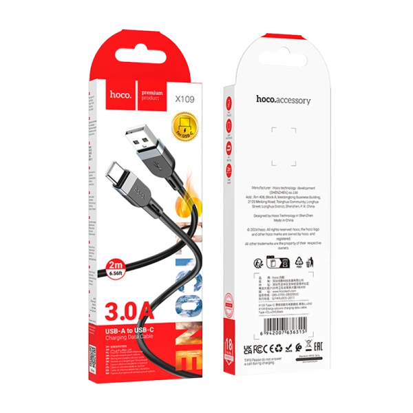 Кабель HOCO X109 USB (m)-Type-C (m) 2.0м 3.0A силикон черный.