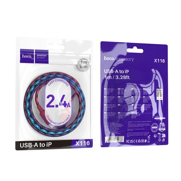 Кабель HOCO X116 USB (m)-Lightning (m) 1м 2.4A нейлон красный (1/68/680)