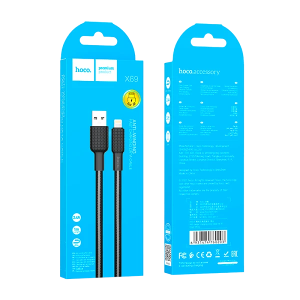 Кабель HOCO X69 USB (m)-Lightning (m) 1м 2.4A нейлон белый черный.