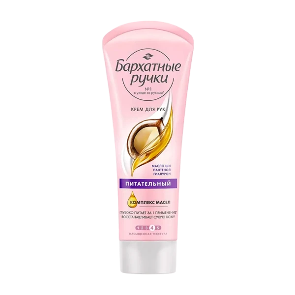 Питательный крем для рук Бархатные Ручки 80 мл. Смягчает кожу рук, устраняет сухость и обладает насыщенной структурой. Комплекс эффективно действующих компонентов: масло ши, провитамин В5 и масло авокадо - оказывает увлажняющее и успокаивающее действие, питает кожу, повышает ее эластичность. Ваша кожа потрясающе гладкая, нежная и бархатистая, излучает молодость и красоту!