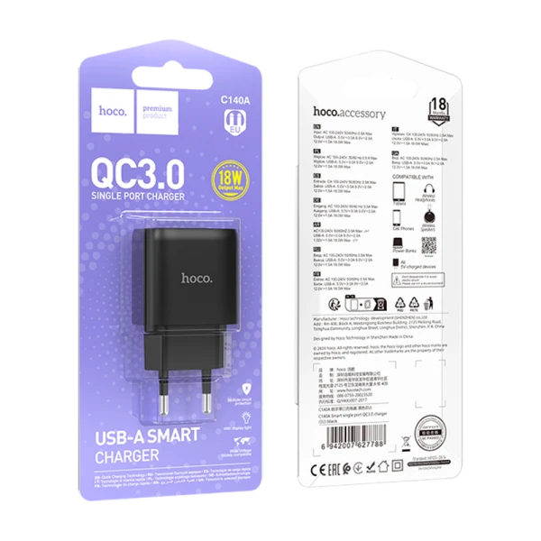 Стильное З/У HOCO C140A черного цвета оснащено 1 USB-портом, а также стандартом быстрой зарядки QC3.0. Зарядное устройство выполнено из материалов только высокого качества, что гарантирует безопасную зарядку аккумуляторов ваших устройств.
