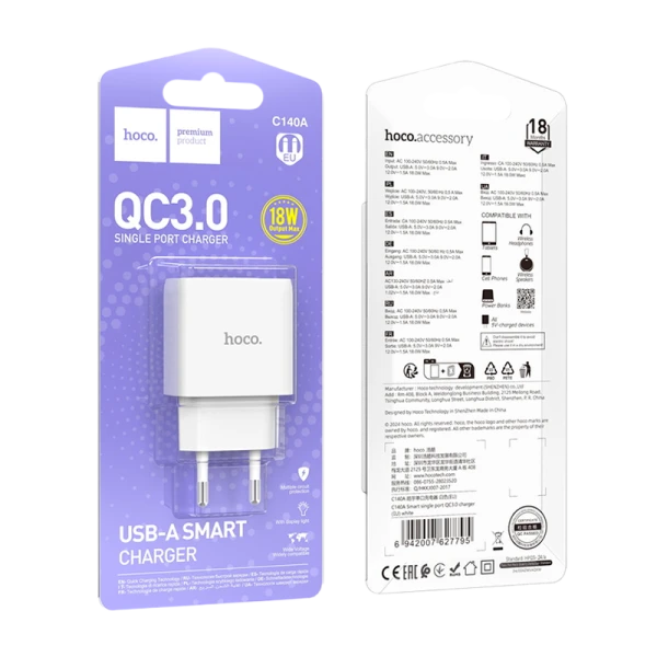 Стильное СЗУ HOCO C140A оснащено 1 USB-портом, а также стандартом быстрой зарядки QC3.0. Зарядное устройство HOCO C140A выполнено из материалов только высокого качества, что гарантирует безопасную зарядку аккумуляторов ваших устройств.