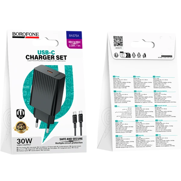 Сетевое зарядное устройство Borofone BAS75A с кабелем Type-C, черный цвет – это универсальное и мощное решение для быстрой зарядки ваших устройств. Оно оснащено одним Type-C портом, поддерживающими быструю зарядку по стандартам PD (Power Delivery) и QC3.0 (Quick Charge 3.0). Это позволяет быстро и эффективно заряжать устройства с разъемами Type-C.