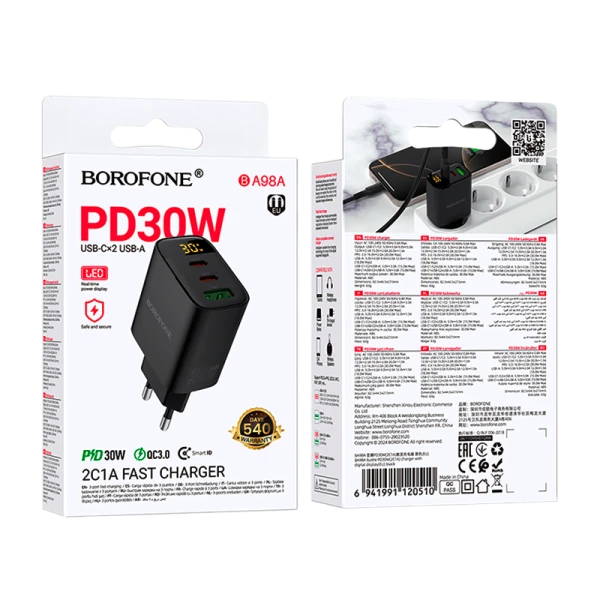 Сетевое З/У Borofone BA98A 1USB+2Type-C 3.0A 30W дисплей черный (1/46/184)