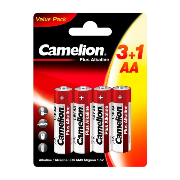 Щелочные батарейки Camelion Plus LR6 BP3+1 мощностью 1.5В идеально подходят для фотоаппаратов, пультов управления и других приборов с высокой нагрузкой.