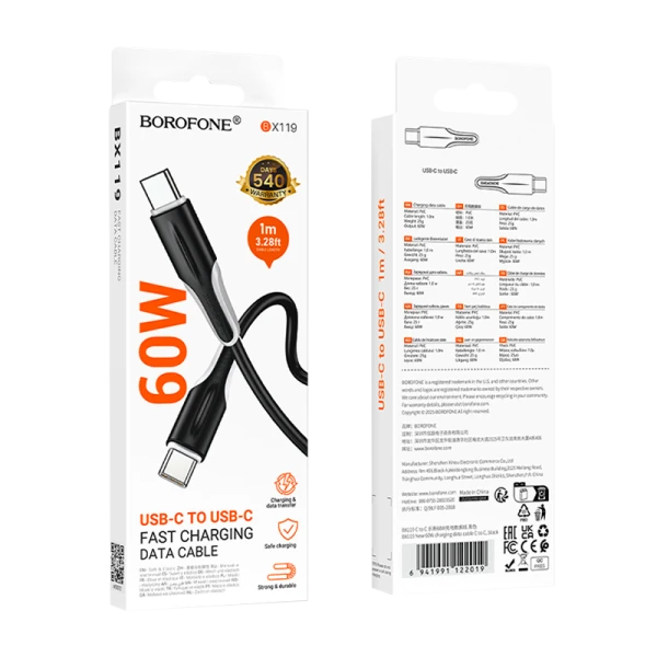 Дата-кабель Borofone BX119 - это высококачественный кабель для передачи данных и быстрой зарядки устройств с разъемами Type-C. Поддерживает стандарт Power Delivery (PD) и обеспечивает мощность до 60W, что позволяет быстро и эффективно заряжать устройства.