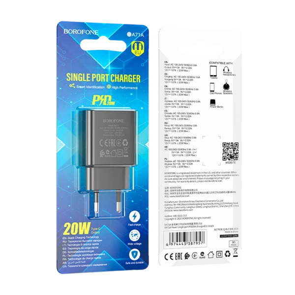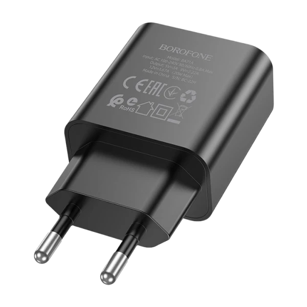 BOROFONE BA71A Power, сетевой зарядное устройство с выходом USB 20W, вилка EU, поддержка протоколов быстрой зарядки.