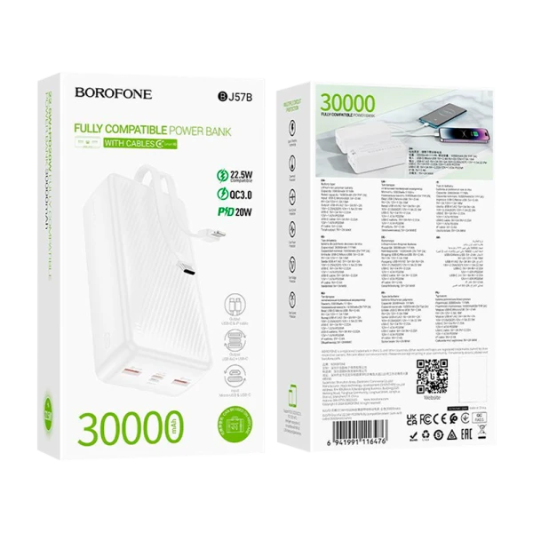 Внешний аккумулятор Borofone BJ57B 30000mAh 2.4A 22.5W 2USB индикация белый (1/24)