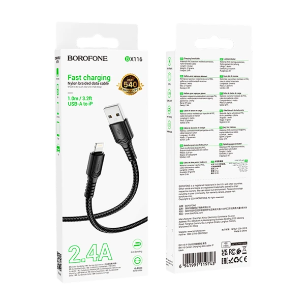 Кабель Borofone BX116 USB (m)-Lightning (m) 1м 2.4A ПВХ черный (1/360)