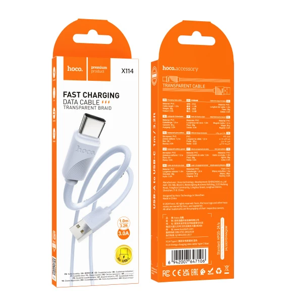 Кабель HOCO X114 USB (m)-Type-C (m) 1м 3.0A ПВХ синий (1/31/310)