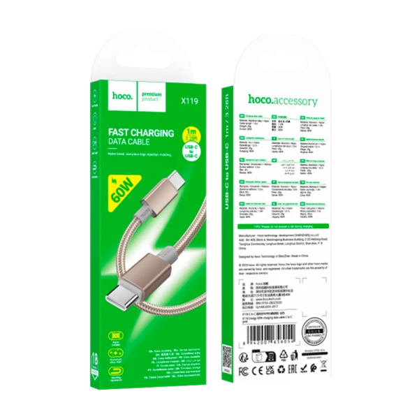 Кабель HOCO X119 Type-C (m)-Type-C (m) 1м 3.0A 60W нейлон PD3.0 золотой (1/420)
