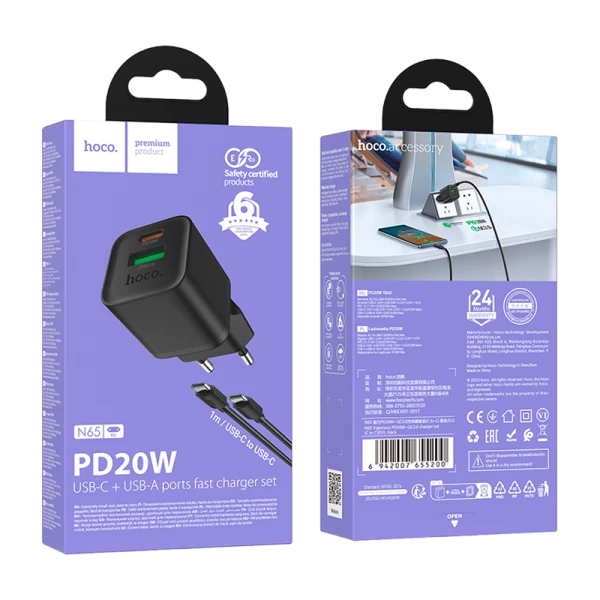 Сетевое З/У HOCO N65 1USB+1Type-C 20W PD,QC с кабелем Type-C/Type-C черный.