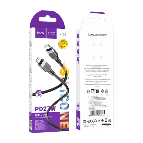 Кабель HOCO X109 Type-C (m)-Lightning (m) 2.0м 27W силикон черный.