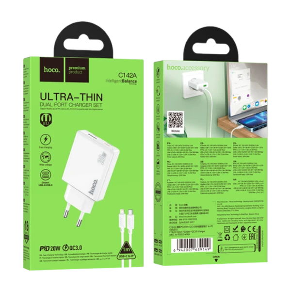 Сетевое З/У HOCO C142A 1USB+1Type-C 20W PD,QC с кабелем Type-C-Lightning белый.