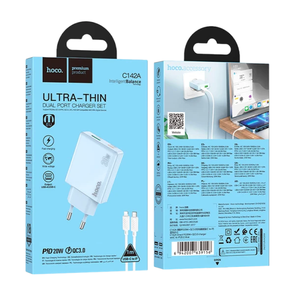 Сетевое З/У HOCO C142A 1USB+1Type-C 20W PD,QC с кабелем Type-C-Lightning голубой (1/19/190)