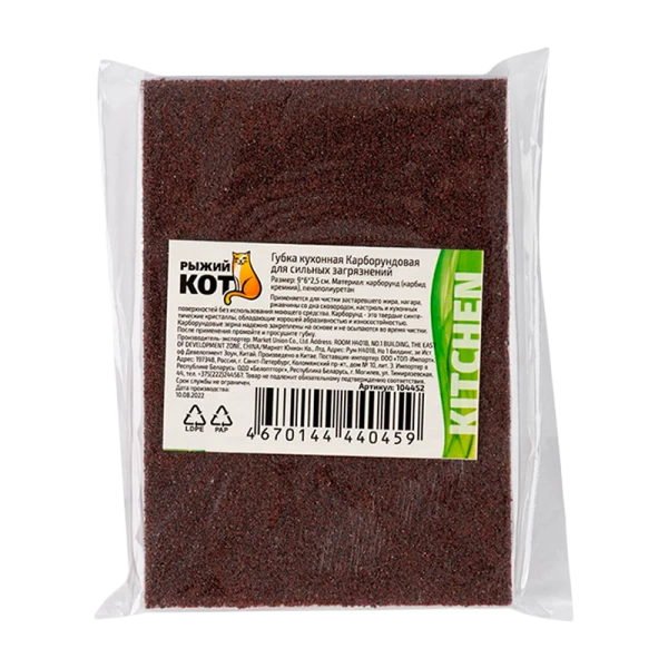 Губка для сильных загрязнений Рыжий кот применяется для чистки застаревшего жира, нагара, ржавчины со дна сковородок, кастрюль и кухонных поверхностей, без применения моющего средства. Карборундовые зерна надежно закреплены на основе и не осыпаются во время чистки. Карборунд - это твердые синтетические кристаллы, обладающие хорошей абразивностью и износостойкостью. Жесткое покрытие и поролоновая основа идеально подходят для обработки плоских поверхностей. После применения промойте и просушите губку. Размер: 10*7*2,5 см;