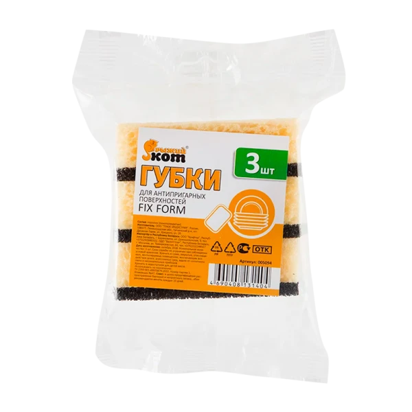 Губки для антипригарных поверхностей Рыжий кот FIX FORM 60х93х30мм 3шт. изготовлены из крупнопористого поролона, который эффективно очищает загрязненные поверхности. Прямоугольная форма позволяет удобно держать губку в руке.