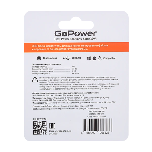 Флеш-накопитель GoPower HIT имеет практичный дизайн, прочный корпус и надёжность в эксплуатации. Классический корпус черного цвета, с колпачком. Оптимальная скорость чтения и записи данных обеспечивает комфортное использование флеш-накопителя.