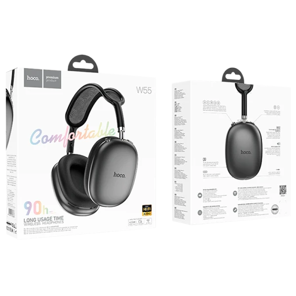 HOCO W55 — стильные беспроводные полноразмерные наушники для использования с ТВ, аудио, видео техникой, компьютером, телефоном или ноутбуком, обеспечивают беспроводную связь через версию Bluetooth 5.4. Наушники HOCO W55 оснащены удобными, мягкими амбушюрами, в которых не чувствуется дискомфорт даже при длительном использовании. Гарнитура оснащена слотом для карты памяти, что дает возможность сделать из наушников аудиоплеер mp3. Устройство имеет емкость батареи: 800mAh, время работы в режиме использования составляет 90 часов, в режиме ожидания до 200 часов. Полная зарядка батареи займет около двух часов. Имеет два языка уведомлений - английский и китайский.