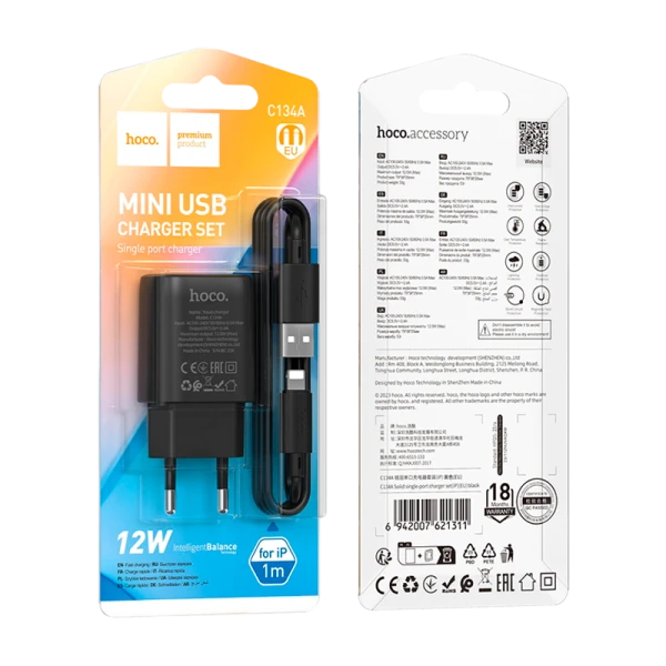 Сетевое З/У HOCO C134A 1USB 2.4A 12W с кабелем Lightning черный (1/28/168)