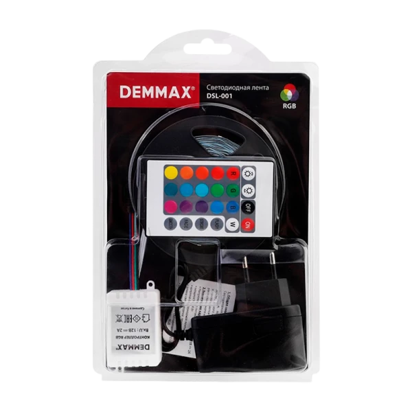 Demmax DSL-001 - качественная светодиодная лента RGB длиной 5 метров, комплектуется пультом, контроллером и блоком питания.