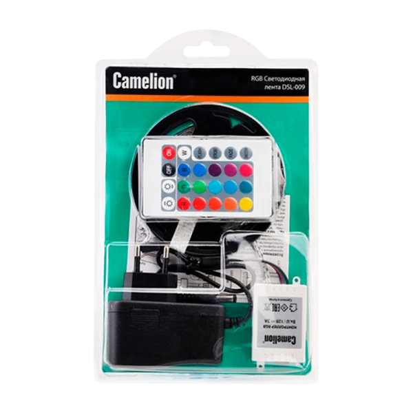 CAMELION DSL-009 – это светодиодная лента длиной 5 метров с функцией RGB и степенью защиты IP 20. Она поставляется вместе с контроллером, блоком питания и пультом управления. Лента оснащена светодиодами 2835-54D/RGB и имеет общую мощность 24 Вт.
