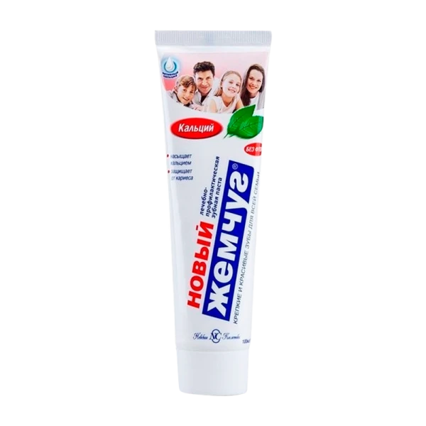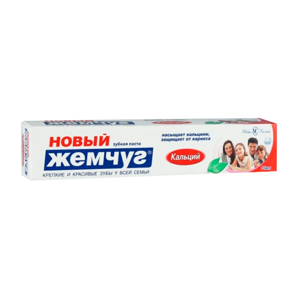 Новый Жемчуг Кальций — лечебно-профилактическая зубная паста для взрослых и детей старше 3 лет, предупреждает развитие кариеса. Укрепляет эмаль, восполняет дефицит кальция в твёрдых тканях полости рта. Рекомендуется также использовать данную пасту для аппликаций с целью снижения гиперчувствительности эмали к температурному воздействию. Не содержит фтор, особенно рекомендуется для регионов с повышенным содержанием фтора в воде.