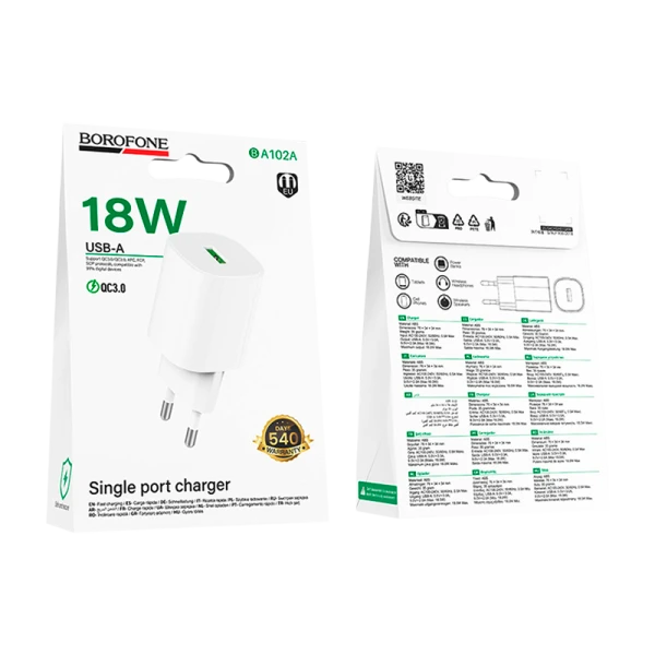 Сетевое З/У Borofone BA102A 1USB 18W QC3.0 белый (1/20/120)