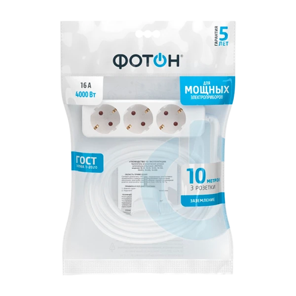 Удлинитель сетевой "ФОТОН" 16-103E с заземлением предназначен для подключения электроприборов суммарной мощностью до 4000Вт. Снабжены защитными шторками, прикрывающими контакты, для обеспечения дополнительной безопасности. Колодка с 3 розетками и длиной провода 10 метров. Полностью соответствует нормам ГОСТ и ЕАС. Корпус изготовлен из термоустойчивого и ударопрочного пластика. Контактная группа из латуни обеспечивает высокую электропроводность и максимально плотный контакт со штырями вилок подключаемых приборов. Гнездовые контакты расположены под углом для одновременного подключения нескольких приборов.
