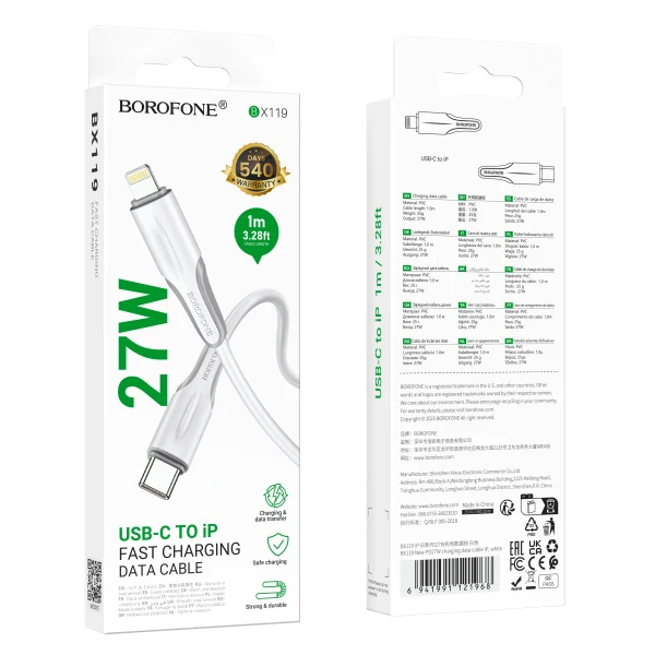 Кабель Borofone BX119 Type-C (m)-Lightning (m) 1м 3.0A 27W ПВХ PD3.0 белый (1/360)