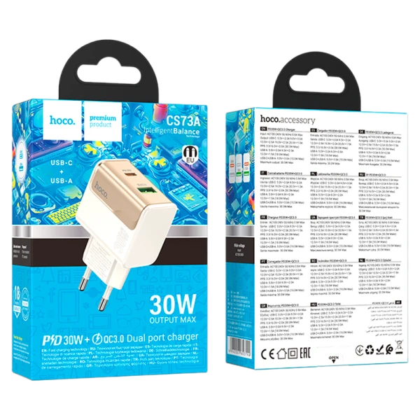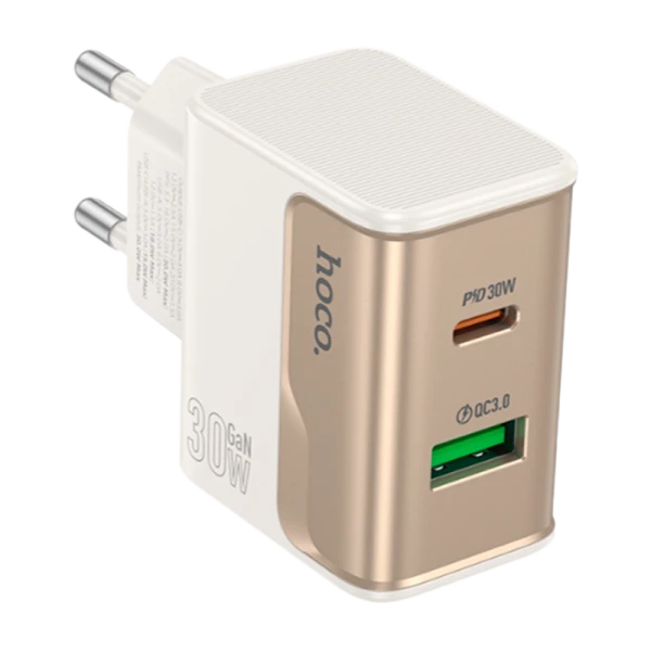 Сетевое зарядное устройство HOCO - это удобное и мощное решение для быстрой зарядки ваших устройств. Оборудовано двумя портами: Type-C с выходной мощностью до 30W (поддержка PD, QC, FCP, AFC) и USB-A с мощностью до 18W (QC, FCP, AFC), что позволяет заряжать современные смартфоны, планшеты и другие устройства в кратчайшие сроки. Корпус изготовлен из прочного ABS-пластика, который обеспечивает надежность, устойчивость к нагреву и долговечность устройства. Компактный и легкий дизайн идеально подходит для использования дома, в офисе или в путешествиях.