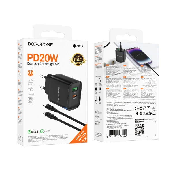 Сетевое З/У Borofone BA83A 1USB+1Type-C 3.0A 20W PD,QC с кабелем Lightning/Type-C черный (1/40/160)