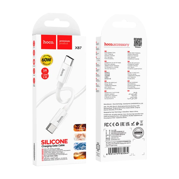 Кабель HOCO X87 Type-C (m)-Type-C (m) 1м 3.0A 60W силикон белый (1/36/360)