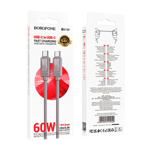 Borofone BX109 - это стильный, прочный и удобный в использовании кабель Type-C-Type-C длиной 1 метр. Качественная оплетка TPE обеспечивает повышенную прочность и защиту от повреждений, что продлевает срок службы кабеля. Поддерживает зарядку ноутбука мощностью 60 Вт и зарядку мобильных устройств током 3A, что обеспечивает быструю зарядку гаджетов и позволяет использовать его для зарядки смартфонов, планшетов, наушников, колонок, внешних аккумуляторов и других устройств с разъемом Type-C.