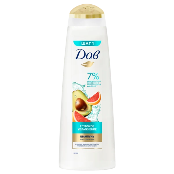Шампунь для волос женский Дав Глубокое увлажнение – это эффективное ухаживающее средство для локонов с гиалуроновой кислотой. Шампунь мягко очищает пряди и действует против сухости. Средство подходит для всех типов волос. Шампунь имеет состав, обогащенный активными ингредиентами. Продукт содержит 7% увлажняющей сыворотки с гиалуроновой кислотой, маслом авокадо, экстрактом грейпфрута и витамином С. Шампунь с гиалуроновой кислотой наполняет стержень волос влагой, обеспечивая коже глубокое увлажнение. Уходовое средство с приятным ароматом грейпфрута, тонким волосам мягкость и упругость, сохраняя концептуальный объем.
